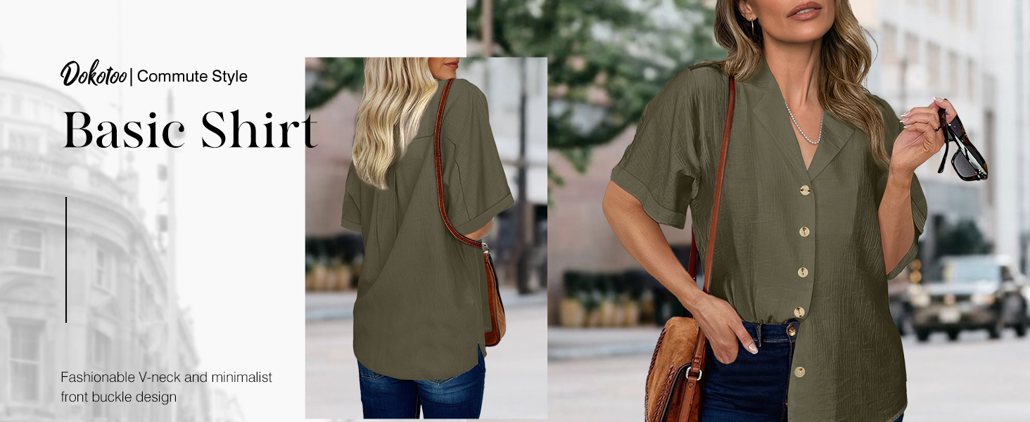 • Dokotoo Women's Dressy Casual V Neck Short Sleeve Button Down Shirts Relaxed Work Business Loose Blouses Tops