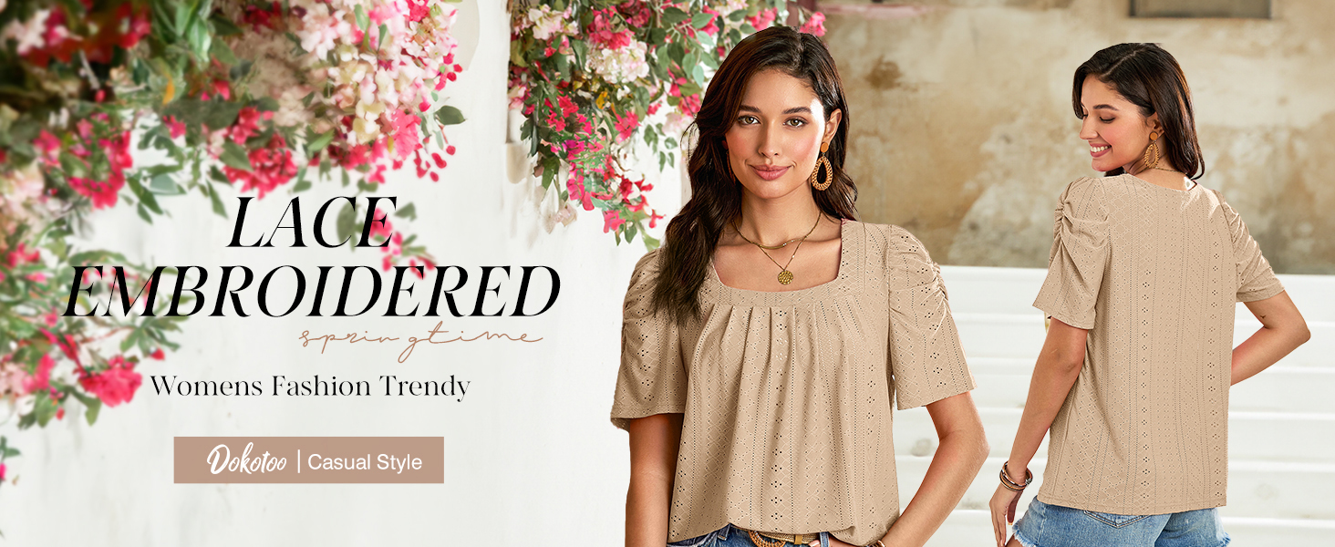 • Dokotoo Women's Hollow Pleated Short Sleeves Square Neck Casual Loose Solid Color Knit T Shirts Tops Blouses