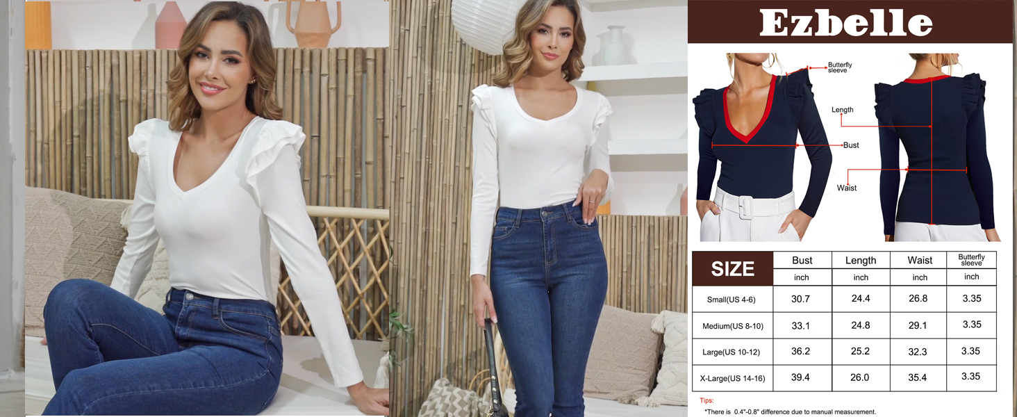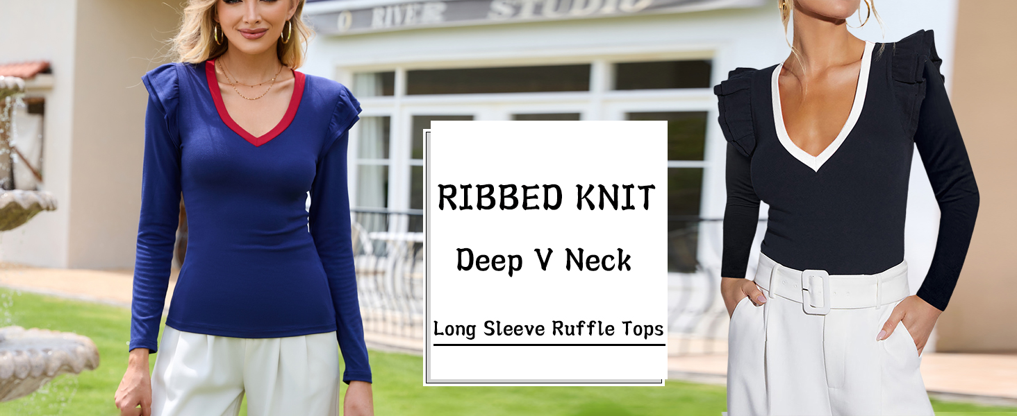 This women's top combines elegance and style with its ruffle long sleeves, V-neck, slim fit, ribbed knit fabric, making it a trendy choice for fall fashion and Thanksgiving