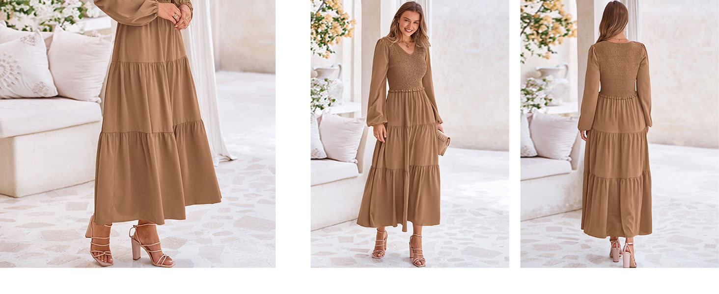 Fashion Style: Long Sleeve/V Neck/Smocked/Solid Color/Fit and Flare