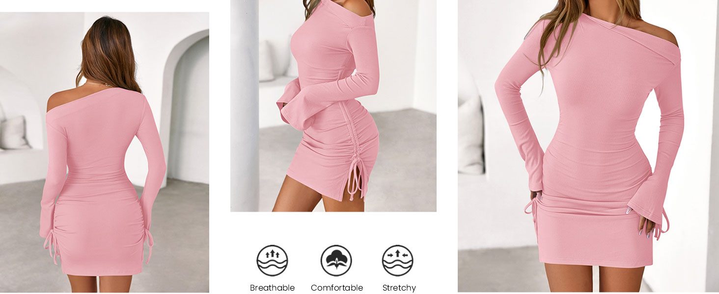 Featuring an off the shoulder dresses for women aesthetic with a single-shoulder twist, this dress exudes daring sophistication.