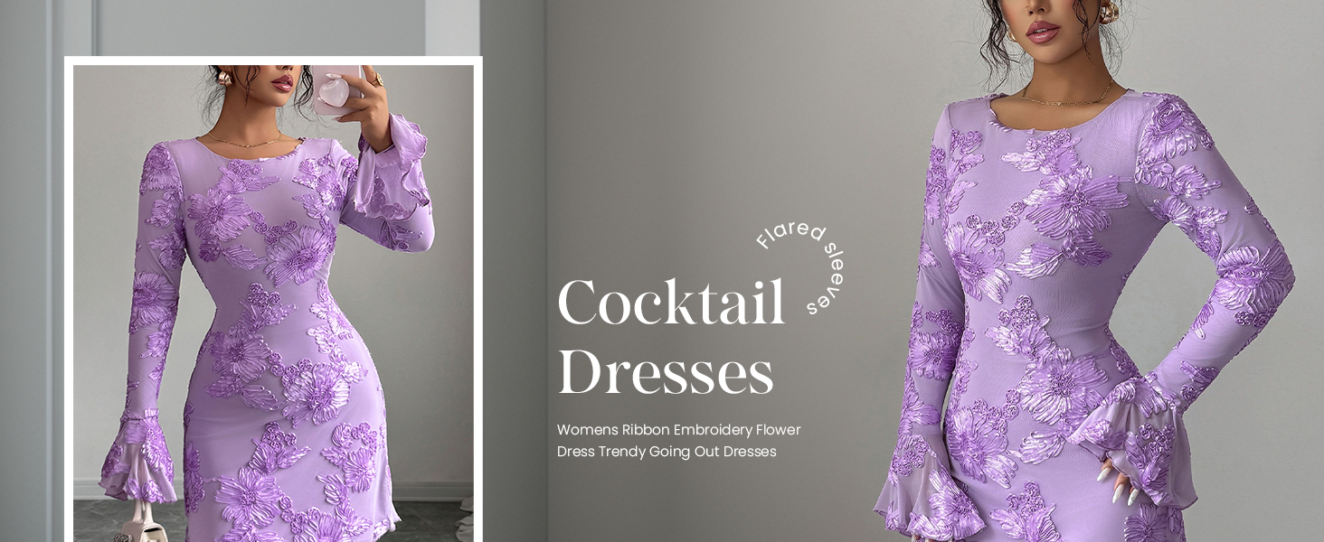• PRETTYGARDEN Women's Floral Embroidered Dress 2025 Fall Long Bell Sleeve Ribbon Flower Mini Short Mesh Bodycon Party Dresses