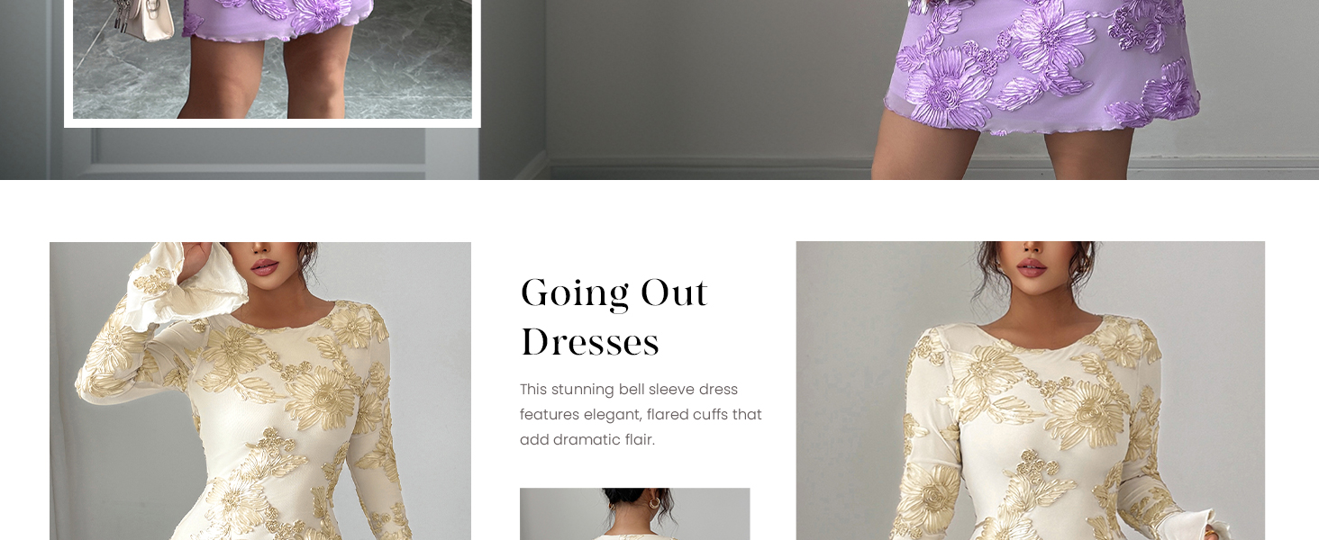 This stunning bell sleeve dress features elegant, flared cuffs that add dramatic flair.